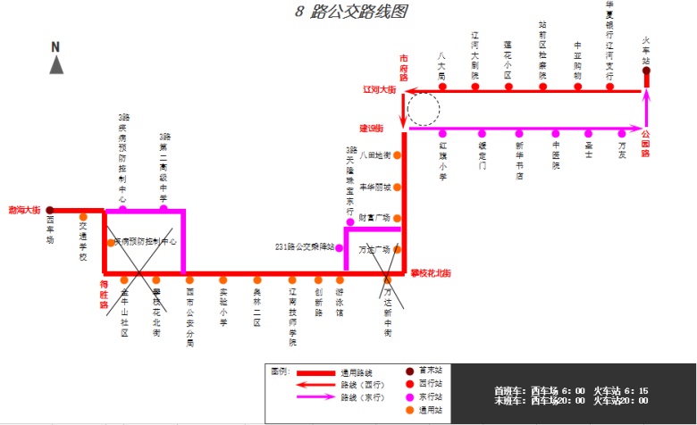 1.走向調(diào)整:“西車場”—渤海大街—平安路—中心街—“西市公安分局”—原線—“游泳館”—體育館路—渤海大街—市府路—“財(cái)富廣場”—原線—“火車站”。