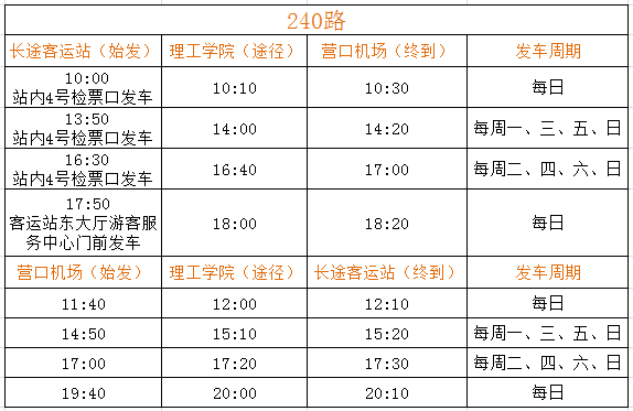 經(jīng)公司營運(yùn)部門與機(jī)場(chǎng)工作人員溝通:從2018年3月25日起,營口藍(lán)旗機(jī)場(chǎng)執(zhí)行新的航班時(shí)刻表(部分航線停發(fā))。針對(duì)上述情況,為方便市民出行,經(jīng)公司研究,現(xiàn)對(duì)機(jī)場(chǎng)240路運(yùn)營班次進(jìn)行調(diào)整。具體內(nèi)容如下: