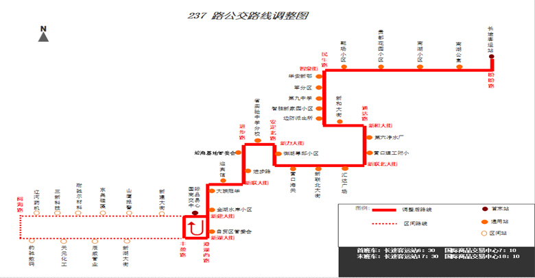 “長途客運站”—原線—新和大街—通達路—新聯北大街—安定北路—原線—澄湖西路—新湖大街—豐盈路—新建大街—“國際商品交易中心”。