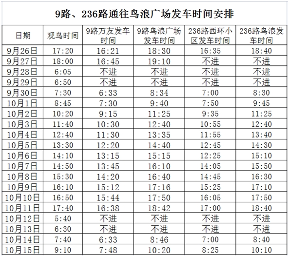 為方便市民“國(guó)慶”“中秋”節(jié)日期間觀賞自然景觀時(shí)順暢出行,營(yíng)口交運(yùn)集團(tuán)適時(shí)調(diào)整部分公交線(xiàn)路班次。從9月26日起—10月15日,公交9路、236路分時(shí)段區(qū)間延伸至大遼河口鳥(niǎo)浪廣場(chǎng)運(yùn)營(yíng)。